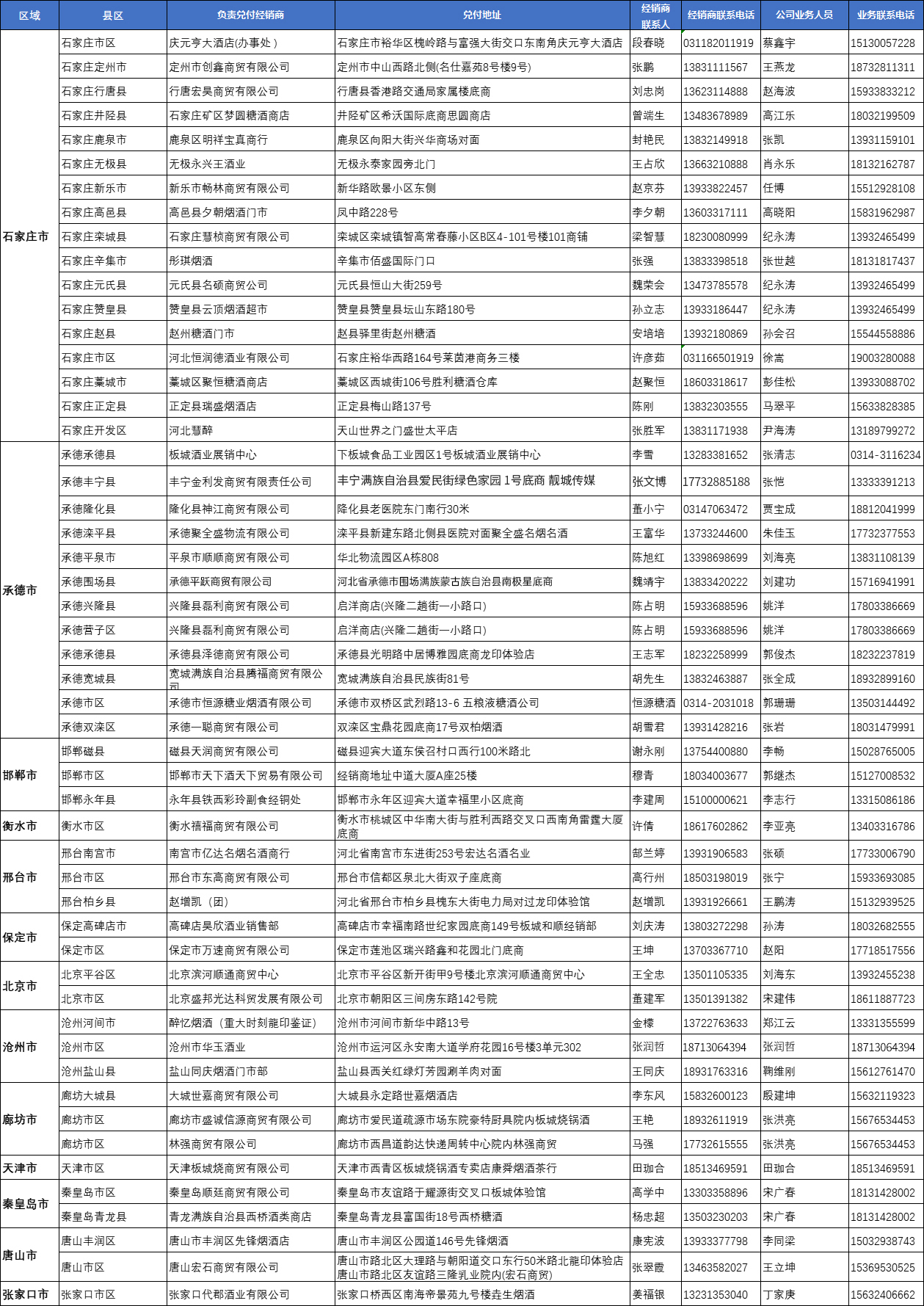 板城酒業(yè)公司定制酒票兌付地點一覽表
