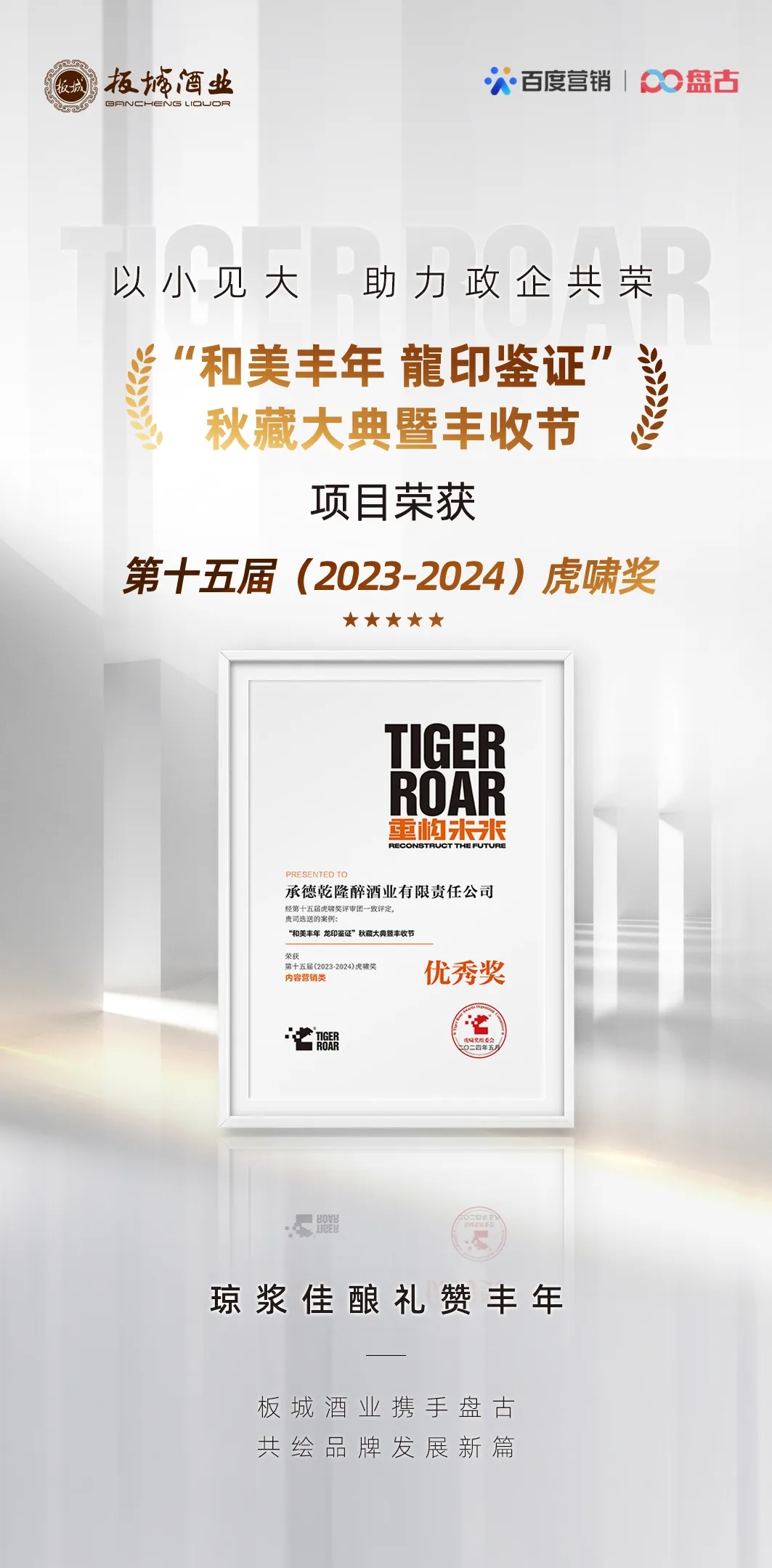 近日,第十五屆虎嘯獎頒獎典禮在上海舉辦,承德乾隆醉酒業(yè)有限責(zé)任公司憑借「“和美豐年龍印鑒證”秋藏大典暨豐收節(jié)」案例,以優(yōu)異的內(nèi)容營銷創(chuàng)意、資源整合能力及出色的營銷效果,從1020家優(yōu)秀企業(yè)提交的4505件參賽作品中脫穎而出,榮獲第十五屆(2023-2024)虎嘯獎內(nèi)容營銷類優(yōu)秀獎。