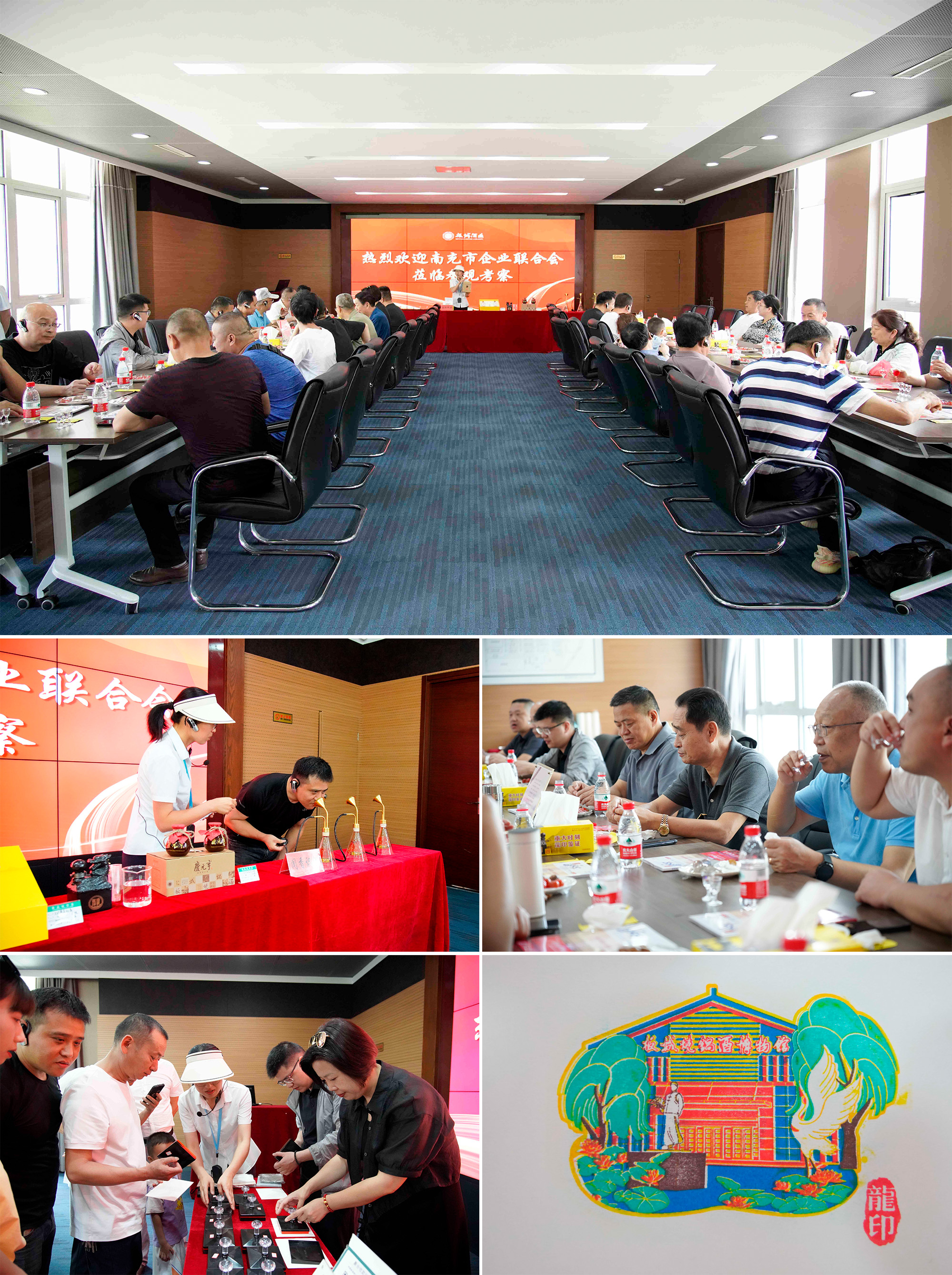 品味板城美酒,參與互動體驗,板城酒博園的講解員為旅行團一行現(xiàn)場講解白酒的文化知識,并帶領現(xiàn)場人員進行有獎互動,通過“聞香識酒”活動來辨別不同白酒的香型,對不同香型的美酒進行品鑒,感受不同白酒酒體的味道與特點。最后,來訪旅行團現(xiàn)場體驗“板城燒鍋酒博物館套印印章”文創(chuàng)產(chǎn)品制作過程。旅行團在感受白酒文化魅力的同時,并購買相關白酒產(chǎn)品,收獲一份佳釀。
