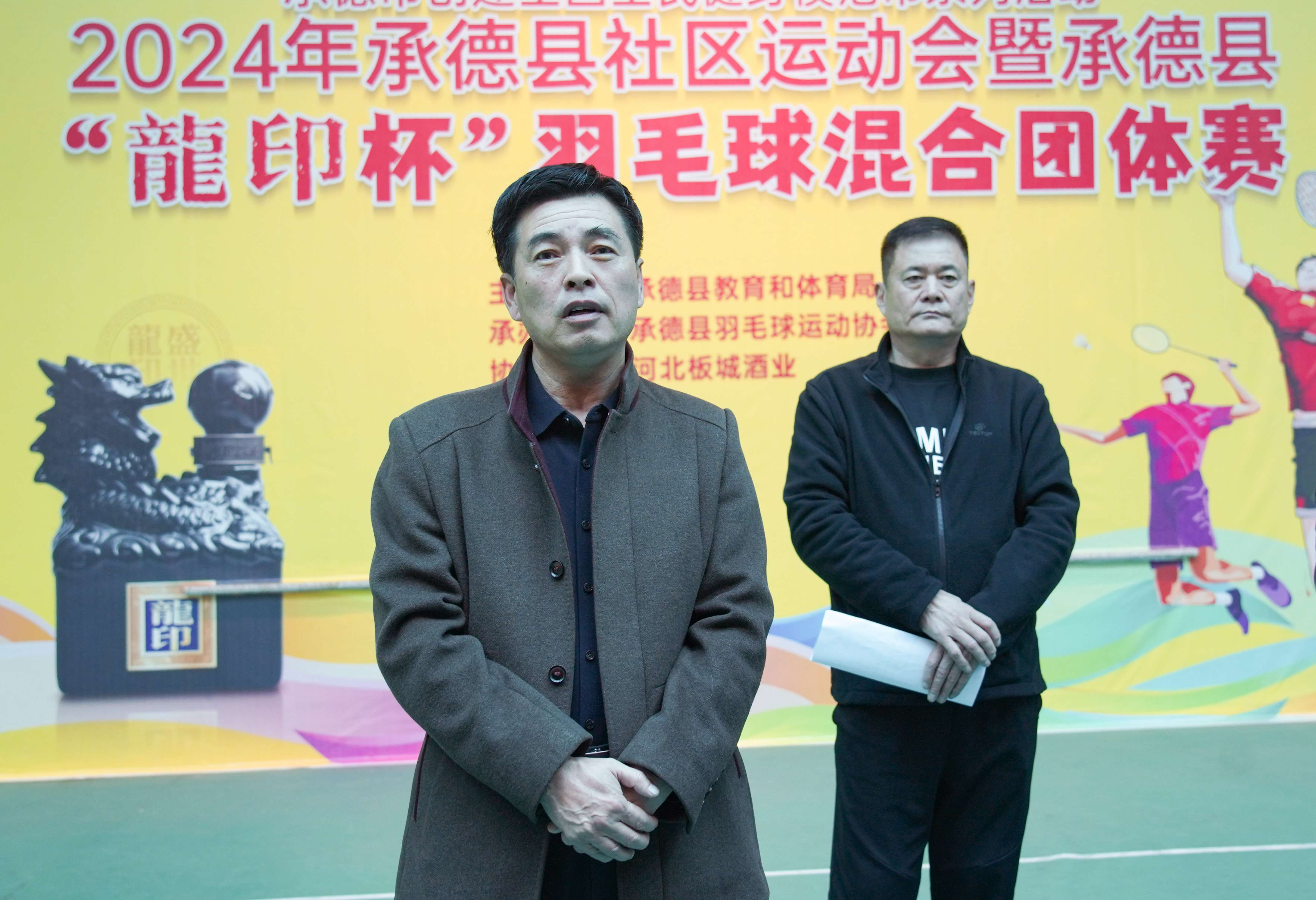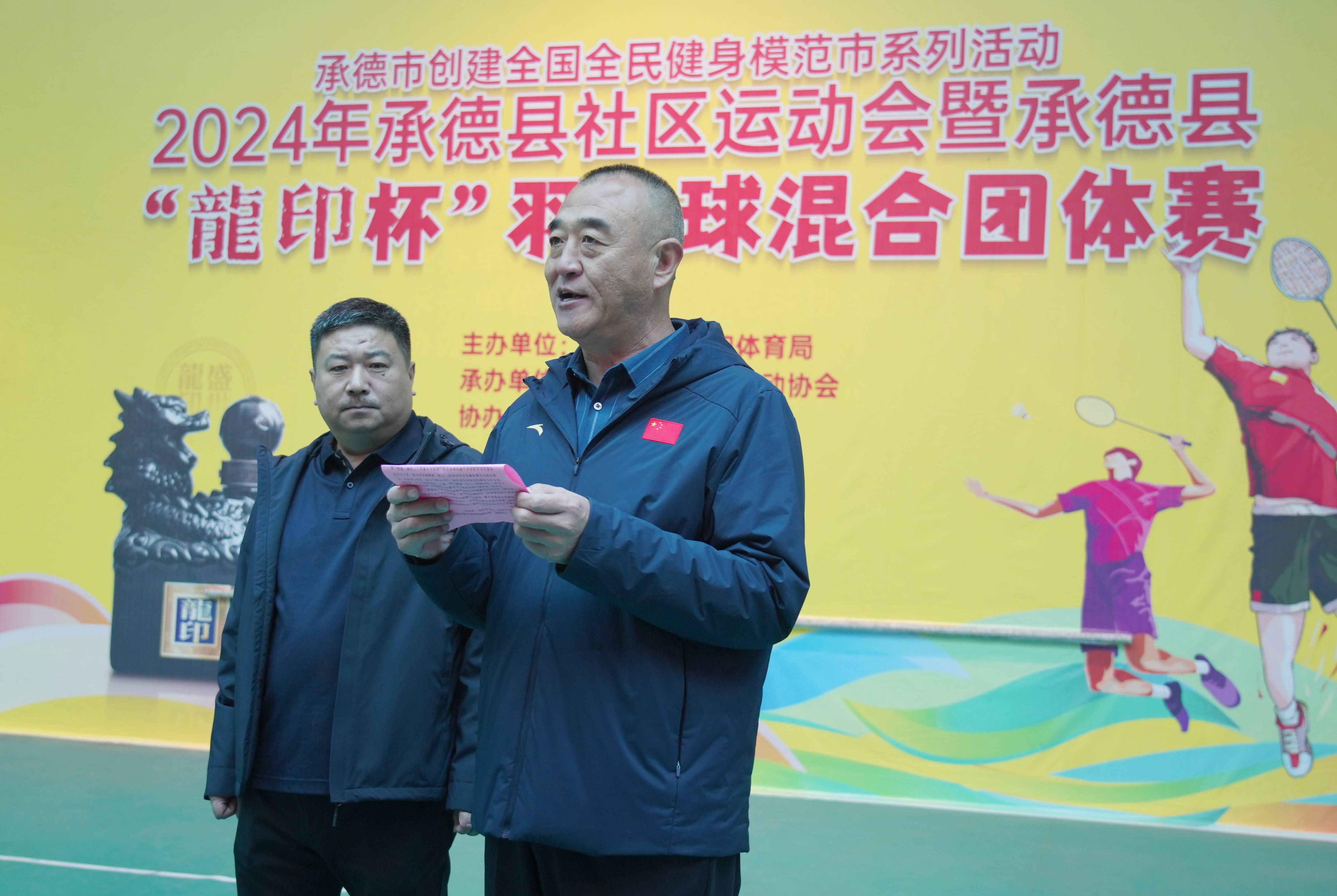 承德縣教育和體育局黨組成員朱瑞東,承德縣羽毛球協(xié)會會長張景玲,秘書長李樹立,板城酒業(yè)生產(chǎn)總經(jīng)理趙志剛,工會主席唐振福,釀酒中心總監(jiān)王金成,承德戰(zhàn)區(qū)縣區(qū)龍印部區(qū)域經(jīng)理陶景奇,承德縣龍印部業(yè)務(wù)經(jīng)理郭俊杰出席本次活動。承德縣羽毛球協(xié)會會長張景玲主持開幕式活動。