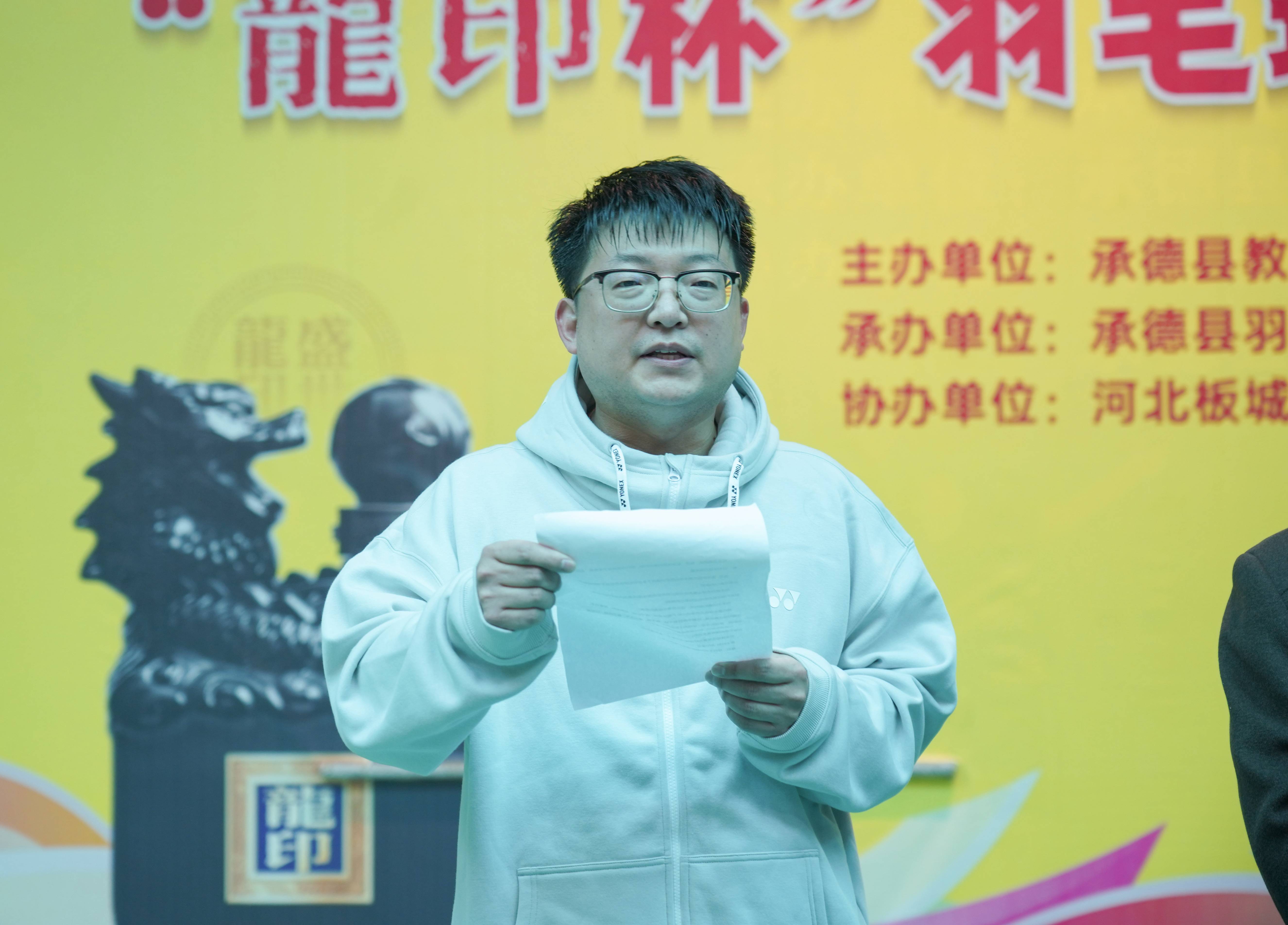 承德縣教育和體育局黨組成員朱瑞東首先進(jìn)行致辭,他表示承德縣教育和體育局積極響應(yīng)全民健身號召,開展了形式多樣的體育活動,羽毛球是一項(xiàng)深受大家喜愛的運(yùn)動項(xiàng)目,通過舉辦此次賽事,增強(qiáng)了大家體育意識,發(fā)揚(yáng)體育精神,有效推動承德縣的體育事業(yè)發(fā)展,希望各參賽人員充分發(fā)揮“團(tuán)結(jié)友愛,奮勇拼搏”的精神,賽出好成績。
