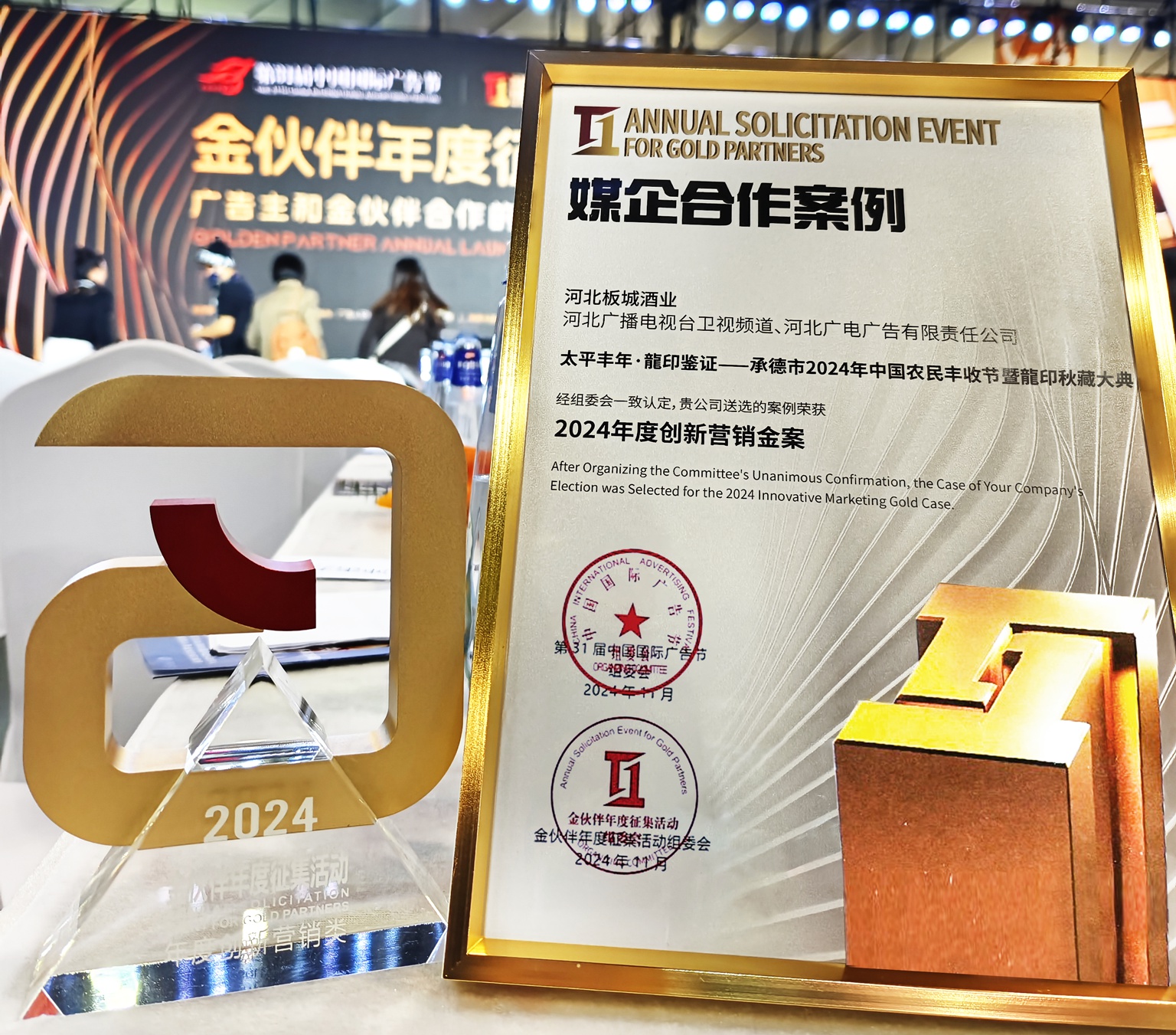 板城酒業(yè)與河北衛(wèi)視頻道合作案例【河北衛(wèi)視聯(lián)合廣電廣告助力板城酒業(yè)農民豐收節(jié)暨龍印秋藏大典】入選31屆中國國際廣告節(jié)·2024廣告主金伙伴年度征集發(fā)布儀式·媒企合作案例·年度創(chuàng)新營銷金案。