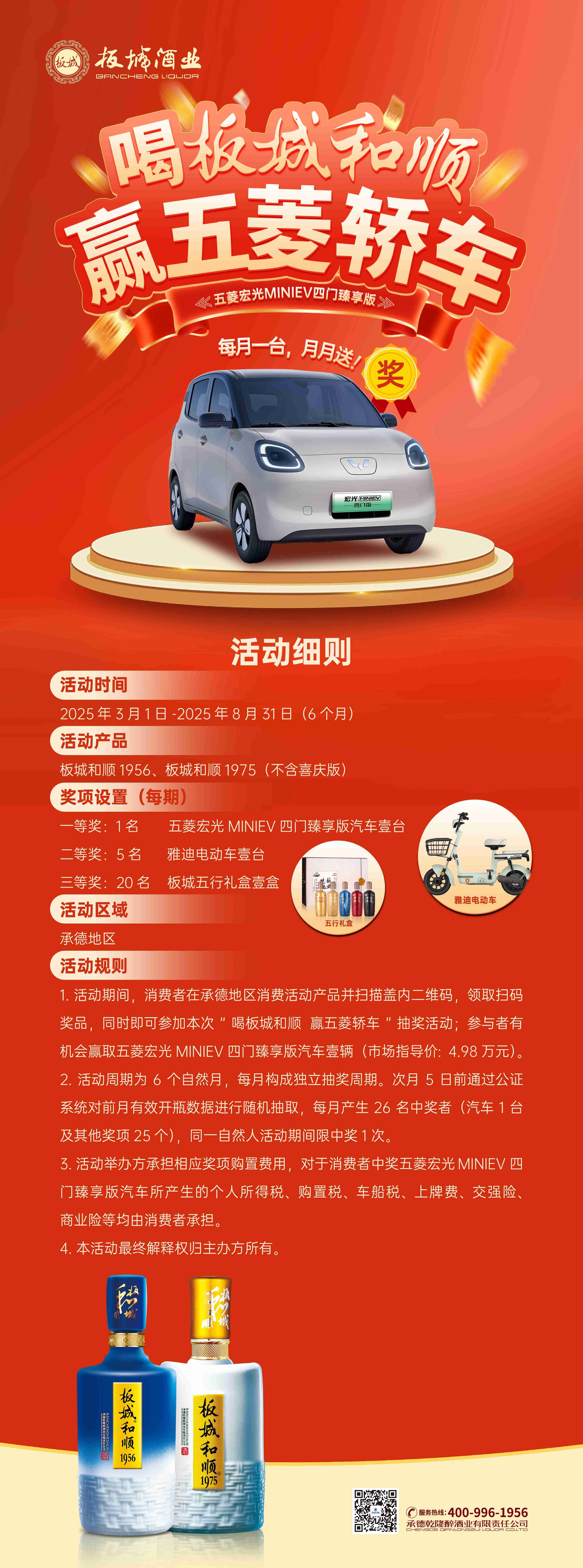 消費(fèi)者在承德區(qū)域購(gòu)買(mǎi)板城和順1975、板城和順1956(不含喜慶版)產(chǎn)品后,掃描瓶蓋內(nèi)二維碼,即可自動(dòng)參與抽獎(jiǎng)。掃碼用戶(hù)除享受原有掃碼獎(jiǎng)勵(lì)外,還可額外獲得贏取五菱宏光MINIEV四門(mén)臻享版汽車(chē)、雅迪電動(dòng)車(chē)等重磅獎(jiǎng)品的機(jī)會(huì)。