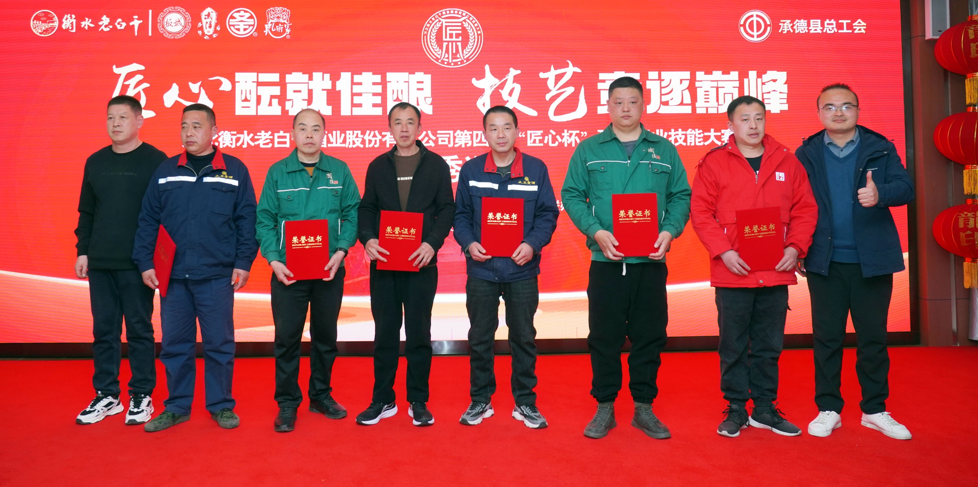 衡水老白干酒業(yè)公司工會副主席孔衛(wèi)東宣讀本次大賽獲獎名單,宣布對獲獎選手進(jìn)行表彰,大賽中36名優(yōu)秀選手經(jīng)過激烈角逐,最終產(chǎn)生“釀酒狀元”1名,“杰出工匠”5名,“技術(shù)能手”12名,“優(yōu)秀選手”18名;本次新增設(shè)“匠心傳承獎”1名。