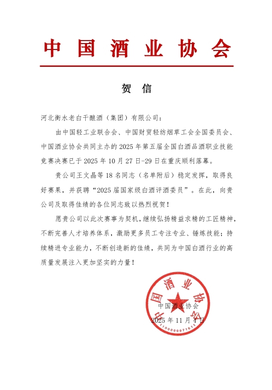 中國酒業(yè)協(xié)會發(fā)來賀信,在恭祝企業(yè)取得良好成績的同時,希望以此次賽事為契機,繼續(xù)弘揚精益求精的工匠精神,不斷完善企業(yè)人才培育體系,持續(xù)增進業(yè)務(wù)能力。